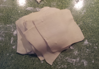Раскатываем пласт теста в прямоугольник, затем разрезаем на три части и каждую часть еще на три, т.е. с одного пласта у нас получается 9 квадратиков