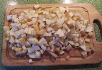 Пока тесто размораживается, нарезаем яблоки на небольшие квадратики