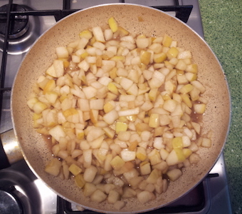Затем разогревам сливочное масло в сковороде и добавляем туда нарезанные яблоки, сахар и корицу. Обжариваем минут 5 пока сахар весь растворится и яблоки станут чуть мягкими.