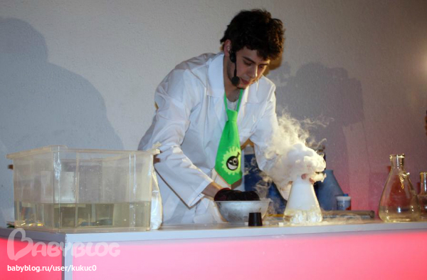 Посетителей ждут три необычных представления. На шоу сумасшедшего профессора можно самим превратить воду в гель, увидеть процесс бурления воды без кипячения и водородный взрыв, потрогать искусственный снег и даже выпустить джина из колбы.