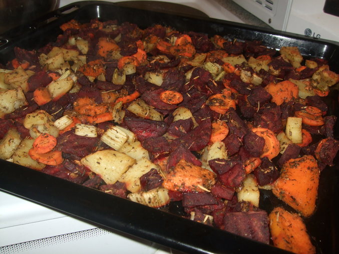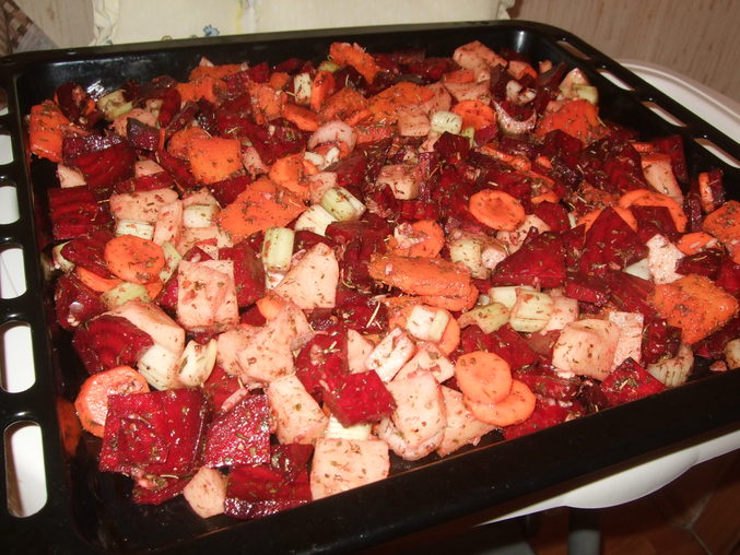 Чистим,режем-свеклу,морковь,картошку,тыкву+соль,приправы,прованские травы-всё смешиваем и в духовку на 1час.