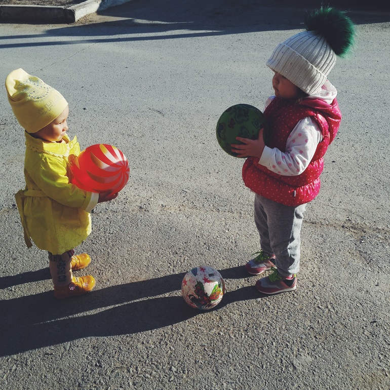 В итоге обе завоевывали мячик девочки постарше))) Расскажите как еще позаниматься с ребенком чтобы заговорил поскорее. Для меня это дикость, т.к. Николь с 1.3 говорила.