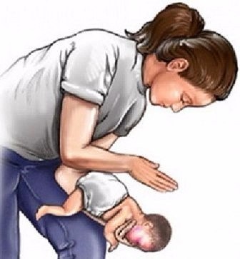 3. Если в дыхательных путях застрял твердый инородный предмет - конфета или мелкая деталь игрушки, положи ребенка на руку лицом вниз. Следи, чтобы голова была ниже грудной клетки при этом. Похлопай малыша между лопатками. Еще вариант: поднять ребенка за ноги и тоже похлопать между лопатками.