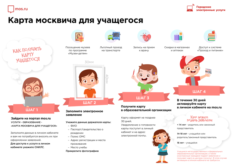 Полезная информация для школьников и их родителей, а также для учащихся колледжей. Оформить карту москвича для учащегося можно на портале mos.ru по ссылке: