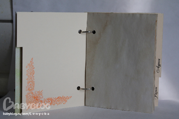 А вот и она))). Странички старила в чае и кофе и каждую проштамповывала. Названия разделов на состаренной бумаге приклеивала к вырезанному вручную картону, на обложке готовый чипборд. закладки разделов рисовала вручную. Пока не хватает опыта и материалов с инструментами.