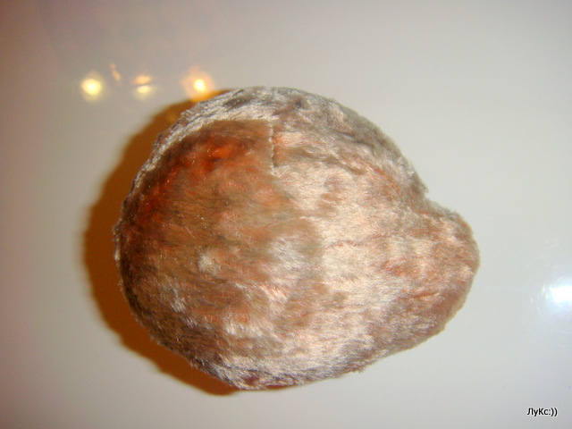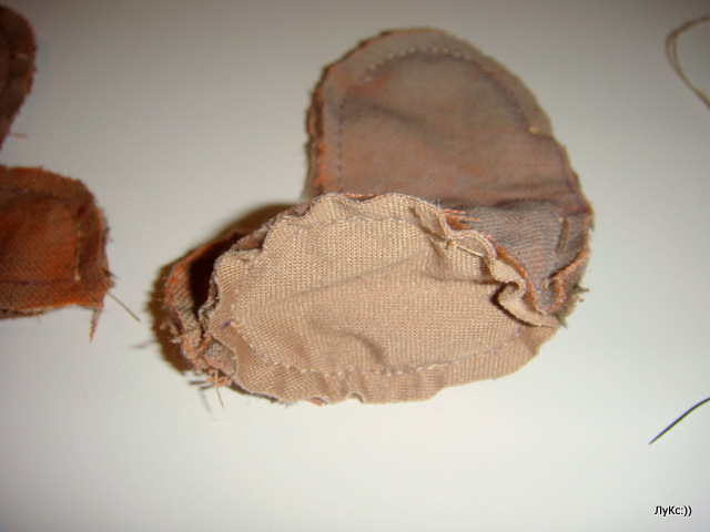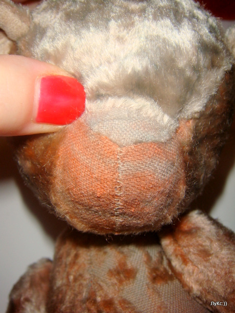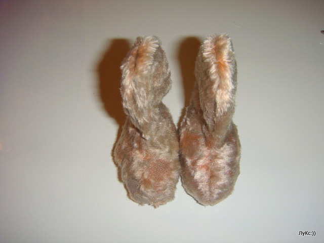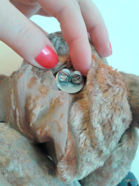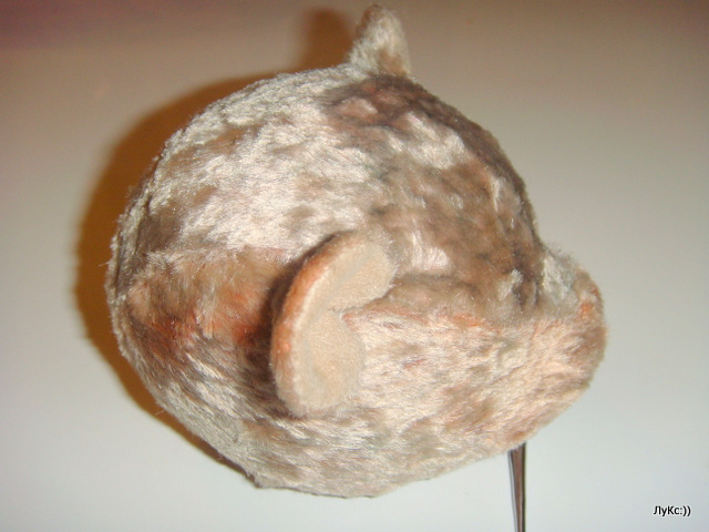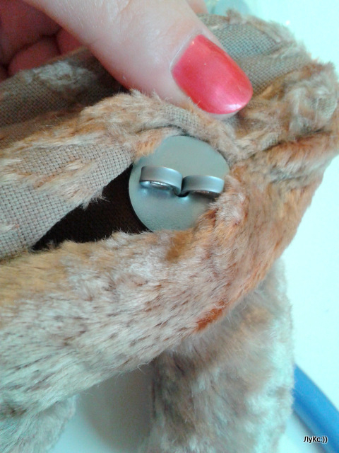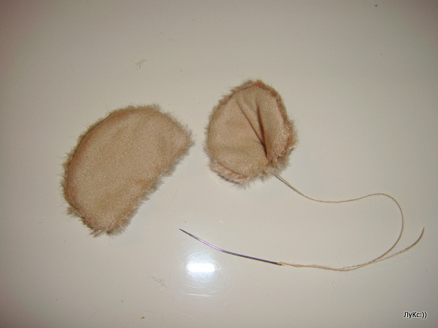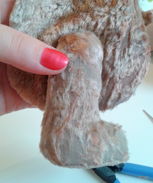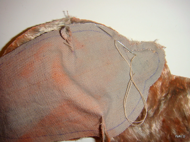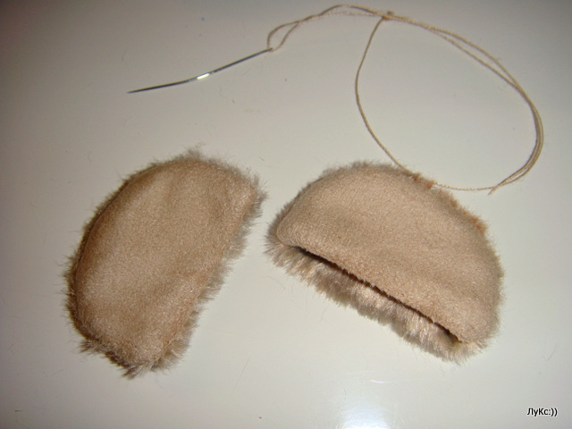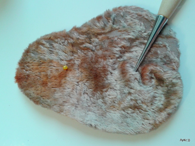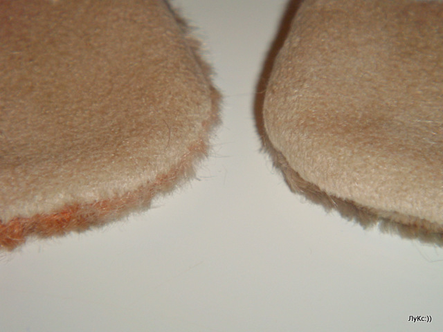 На вывернутых детальках вы заметите, что ворс "вшит" в швы, это легко исправить толстой иглой. Просто надо острием провести туда-сюда несколько раз по вшитому ворсу, и он расправляется и распушается. Вот на примере ушек показываю (справа ушко не обработано)