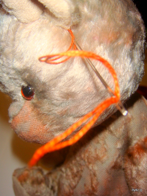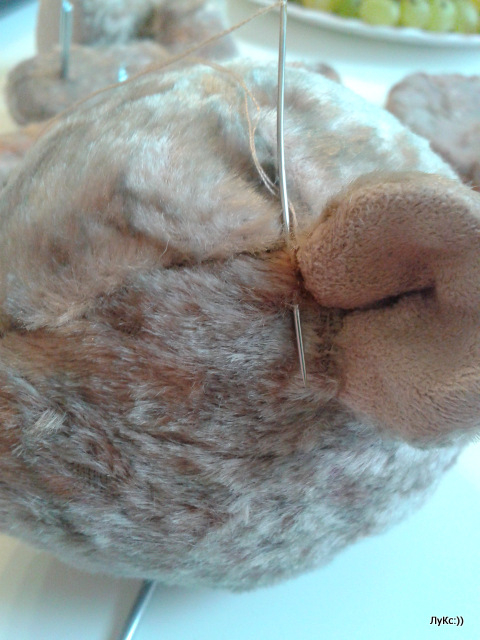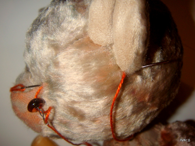 Итак.. В длинную иглу вдеваю крепкие нитки Ирис (нить см 50), никаких узлов не надо. Втыкаем иглу в точку соединения нижнего края ушка и головы, стараемся попасть точно. И вывести иглу надо точно в центре углубления для глаза.