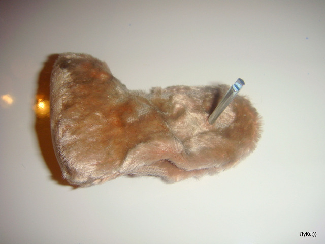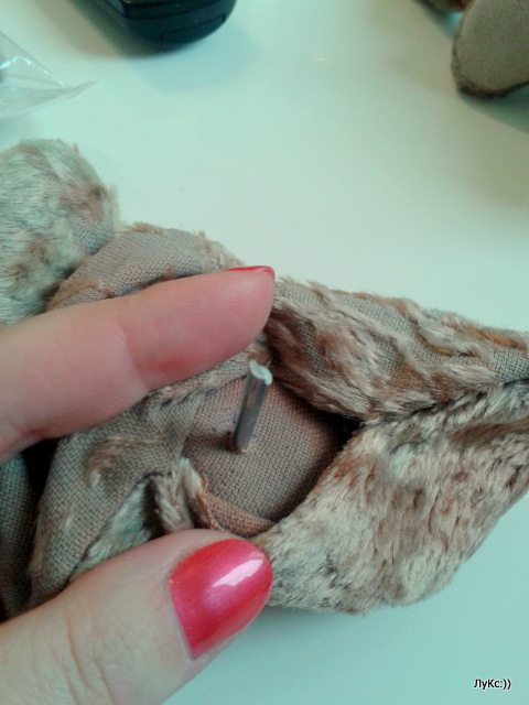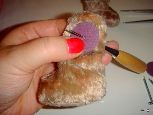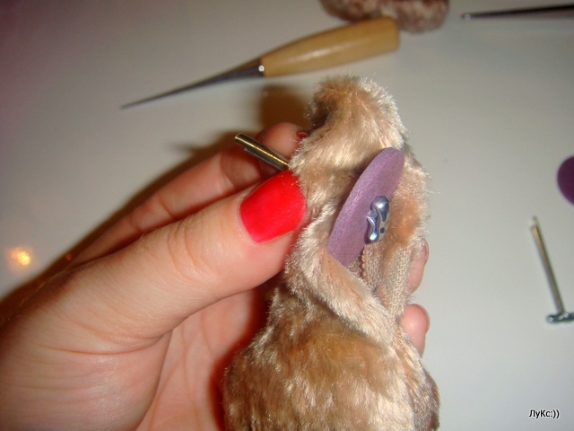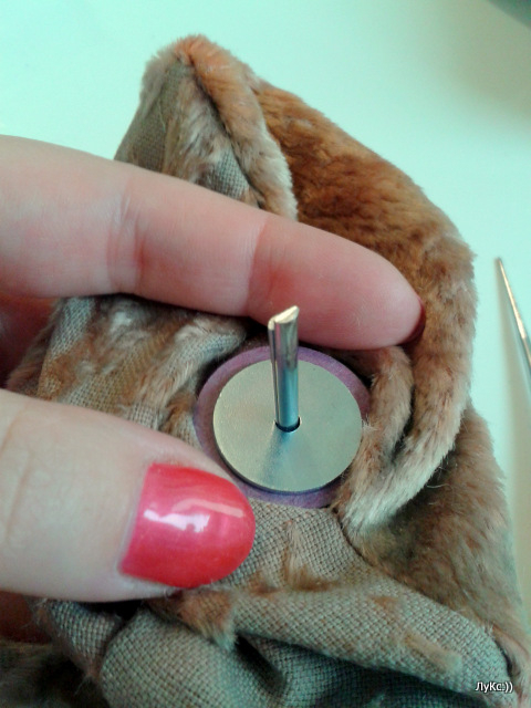 Острие шила вводим в отверстие для набивки и вворачиваем-втыкаем точно в центр диска, таким образом плюш проткнут в самом оптимальном месте (проткнута только внутренняя часть ноги). Советую шило именно вворачивать, чтобы острие вошло как бы между нитями основы, не прорывая ее.