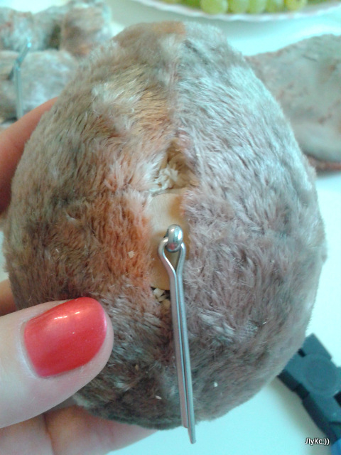 Расправляем плюш и получаем такую конструкцию: нога, из внутренней части которой торчит шплинт, а диск внутри бедра. Это только звучит бредово, на практике все более чем понятно))