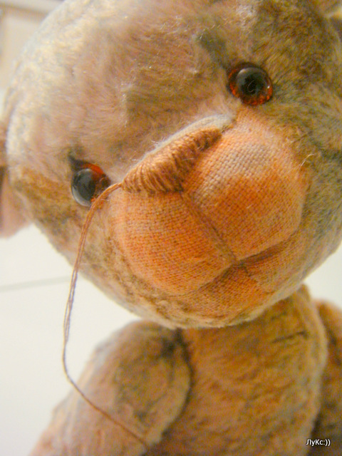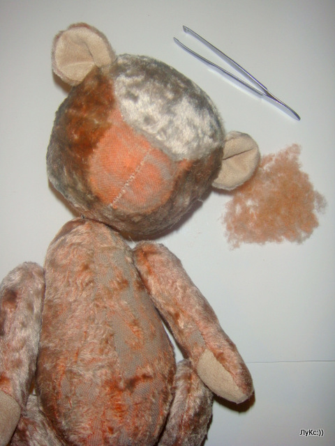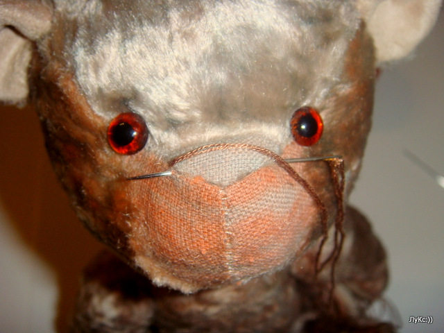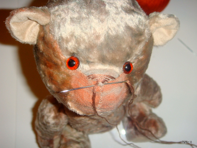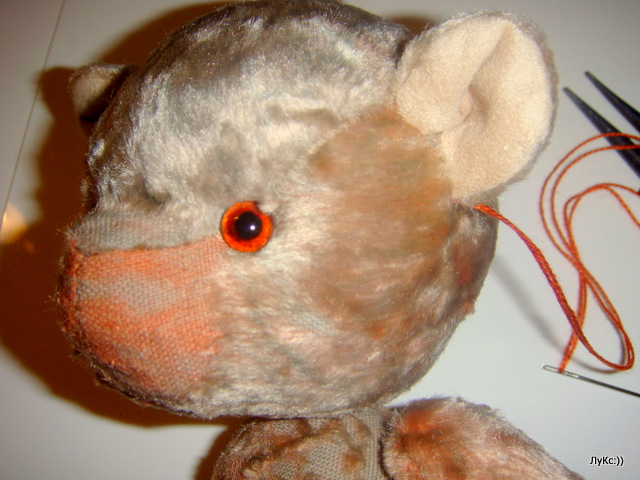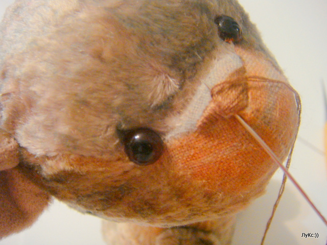 Подготовим мордочку для дальнейшей работы: надо выстричь ножничками или выщипать пинцетом ворс на носике (я выщипываю еще и саму мордочку). Это нужно для того, чтобы ворс не пробивался сквозь вышивку, и нити мулине ложились ровно и красиво. Выщипываем по вкусу и своему чувству прекрасного).![]()