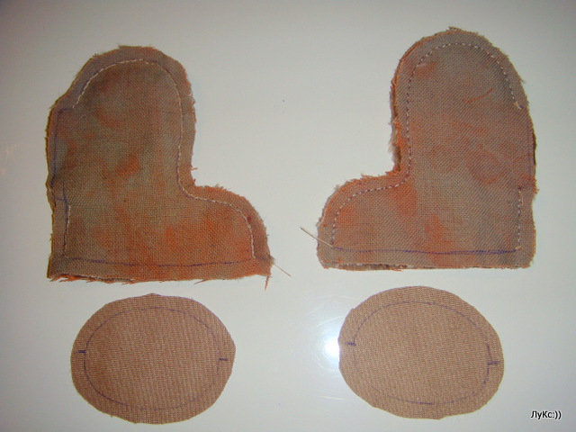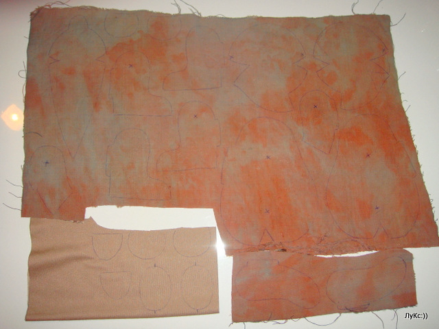 2. ткань для пяточек и ушек (и ладошек) (хлопок, лен, миништоф, фетр, опять же флис и т д), ищем в закромах подходящую по цвету к основному материалу и на НЕТЯНУЩЕЙСЯ основе