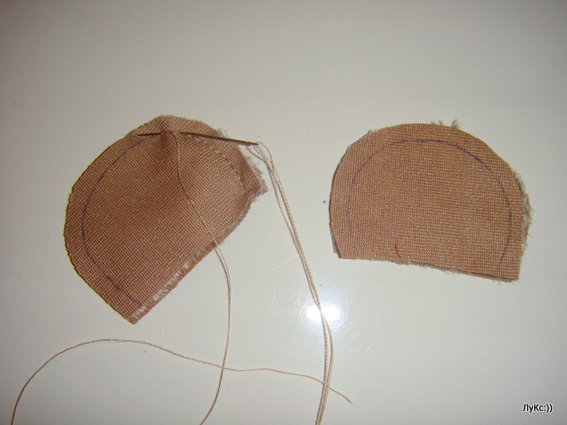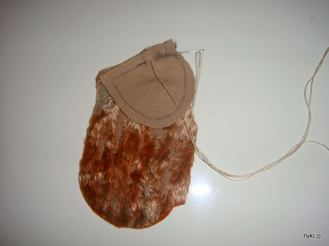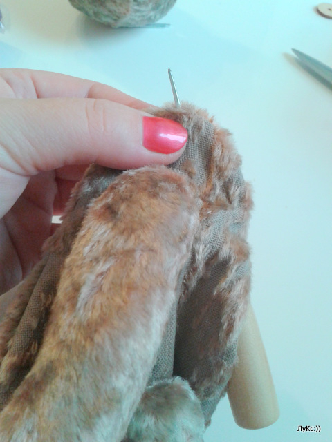 Прикалываем "пельмешкоушки" к голове булавками и пришиваем все тем же потайным швом.