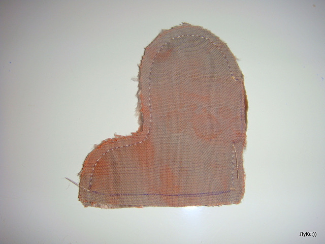 Начинаем сшивать детали. Лицом к лицу складываем ладошку (замша) и внутреннюю часть лапы, сшиваем. Шьем так, чтобы и спереди и сзади шов находился на линиях выкройки (так мы избежим перекосов)