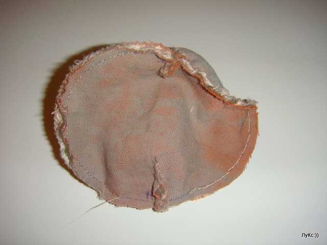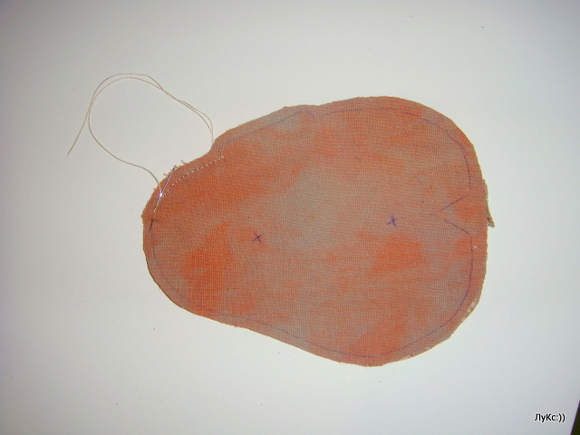 Получаем сшитую голову с незашитым нижним краем. Теперь по контуру сшиваем туловище, оставив незашитыми вытачку и отверстие для набивки.