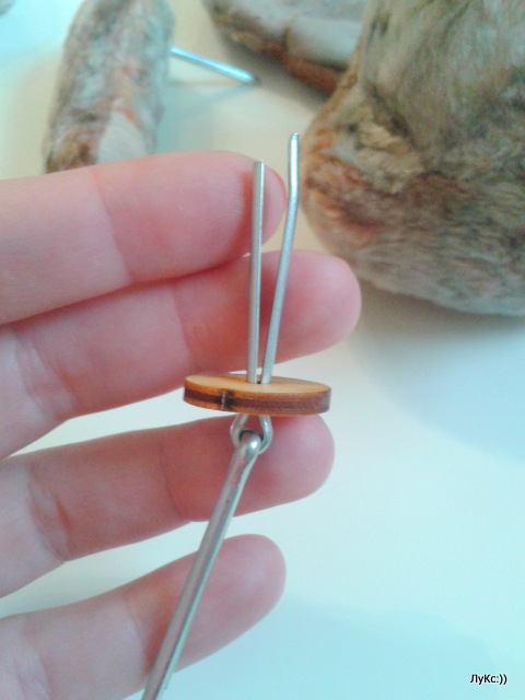 Одеваем петлю глаза на иглу, петельку сжимаем, чтобы она стала узкой и свободно прошла в дырочку глазницы.![]()