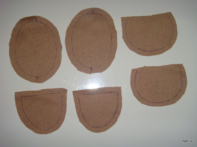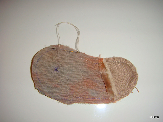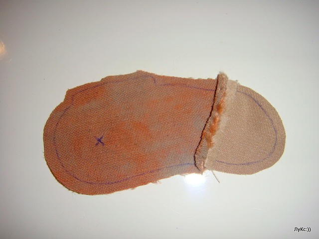 Теперь надо вшить подошву (замша). Полосочки указывают на центр подошвы, их надо совместить с передним и задним швом ноги