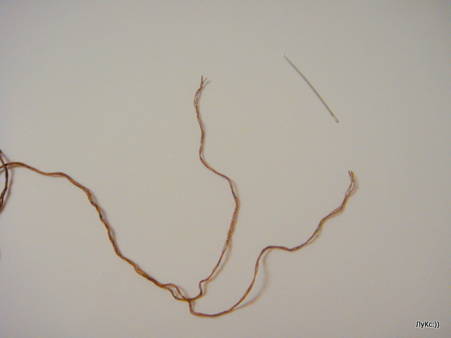 Я вышивала так, беру нитку мулине коричневого цвета (нитка состоит из 6 нитей, делю пополам (вышиваю в 3 нити) длиной 60см.