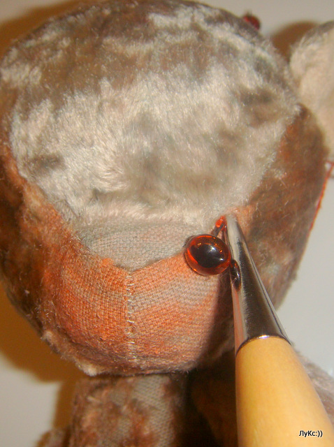 Теперь я буду ставить зверику глаза. У меня стекляные глазки на петле диаметром 8мм (подойдут для мишки ростом 30-35см), цвета Коньяк.![]()