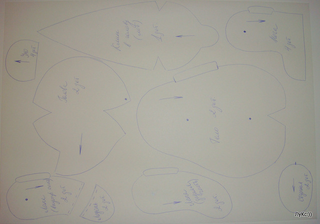 Плюш, из которого я шила очень винтажный, обесцвеченный и покрашенный мной, с потертым ворсом, очень я хотела сшить совсем старенького мишку) Раскладываем выкройку на ткани с учетом НАПРАВЛЕНИЯ ВОРСА! Все стрелочки на выкройке показывают, куда смотрит ворс. Это обязательное условие, особенно для длинноворсных тканей. Детали располагаем, учитывая припуски на швы (примерно 0.5см), на выкройке написано количество деталей, зеркалим все парные детали! Отмечаем на ткани все точки и черточки (это важно) Если видно плохо на этой фоте, то ниже я показала раскладку на ткани (ворс смотрит вниз!) уже вырезанными деталям (только там голова носом вниз должна быть)