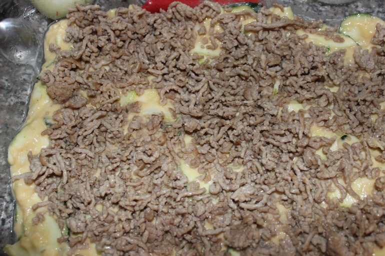 Противень смазываем подсолнечным маслом и выкладываем половина содержимого и готовое мясо (у меня фарш обжаренный):