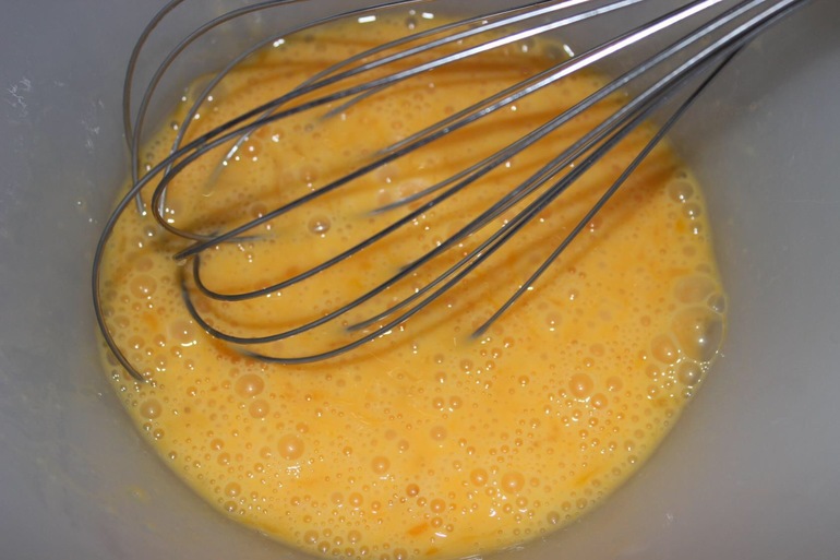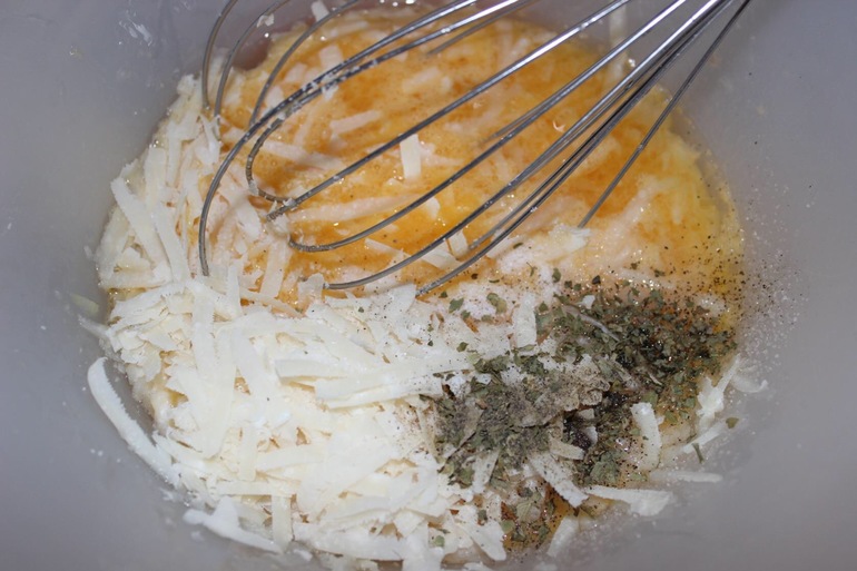 Смешиваем яйца с луком, добавляем подсолнечное масло, сыр, перчим, солим, добавляем зелень.