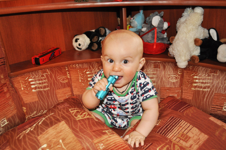 - уверенно самостоятельно встает, держать за опору, раньше только если помогали;