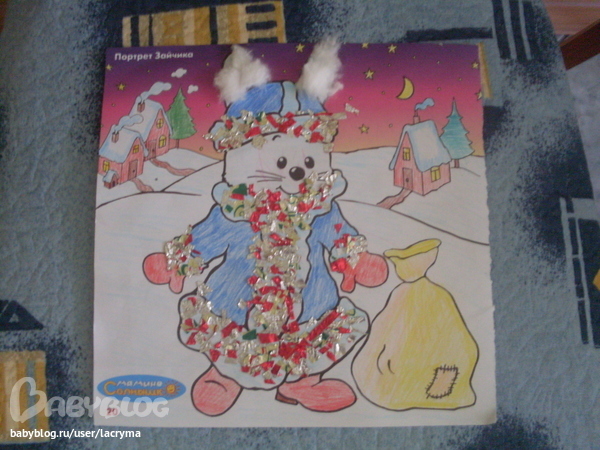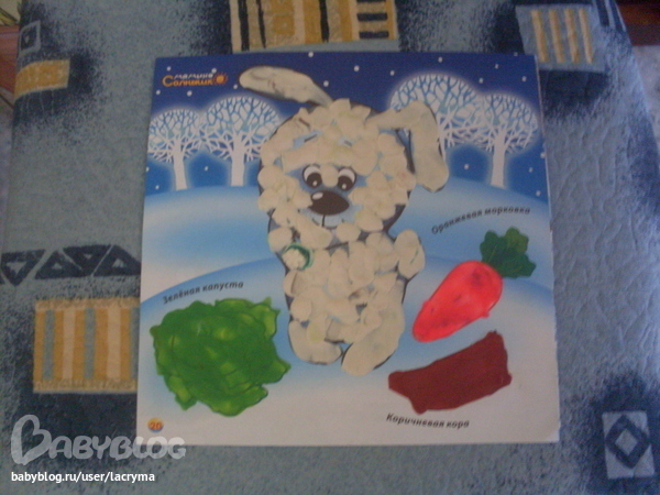 Разукрашивать совсем не хочет, по три-четыре лини проведет - и все, я разукрасила! Клеем любит намазывать и посыпать потом картинку. Пластилин под настроение. Слишком много, видимо, его нам в этом году подарили)