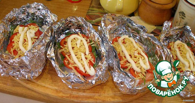 Конвертики завернуть так, чтобы верх не касался рыбы, а то некрасиво будет. Отправляем в духовку минут на 25 (я обычно на 200 гр делаю).