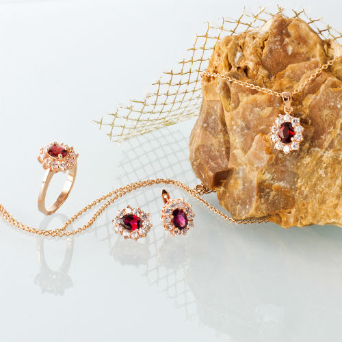Комплект «Гранат» завораживает грациозностью своих форм и превосходным, густо-красным оттенком центральных камней, венчающих каждое из изделий, составляющих этот прекрасный гарнитур. Крупный фианит густого темно-красного оттенка в окружении превосходных камней изумительной чистоты и прозрачности ярко сияет и позволяет нам бесконечно любоваться красивейшей огранкой и прихотливой игрой света, проходящего насквозь. Все изделия из комплекта «Гранат» покрыты золотом, и это добавляет ценности этим украшениям и яркости вашему образу. Материал: сплав недрагоценных металлов, нанесенное гальваническим способом золотое покрытие, фианиты. Серьги с надёжным английским замком. Длина цепи: 50 см + 7 см дополнительных звеньев. Кольцо 19 размера.