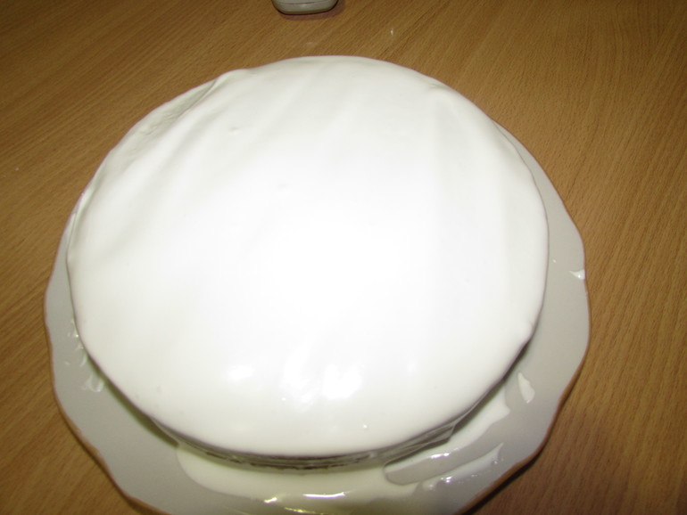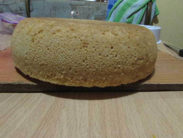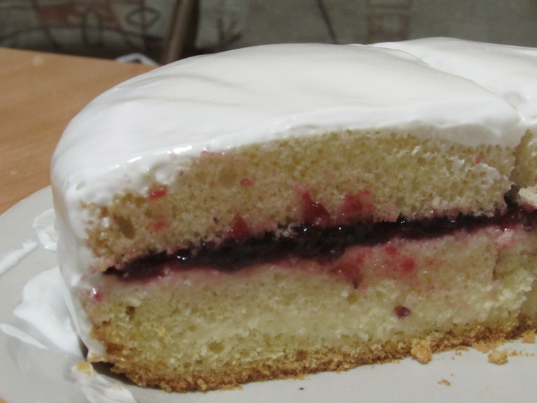 Вот такой у меня получился пышный бисквит, его разрезаем на три коржа, и выбираем любую начинку на вкусу меня начинка первый слой сметанный крем,второй конфитюр ежевика и весь тортик полила взбитыми белками с сахарной пудрой(4 белка+8 ст.л.сах.пудры+1ч.л.лимонного сока).