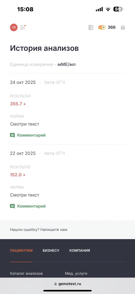 Сдала я ХГЧ второй раз больше, скорее всего не буду. Растет он у меня просто аналогично, как с двойней (в тот раз на 14 ДПО было 140, на 16 ДПО 306). Сейчас на 14 ДПО 152, на 16 ДПО 355. Интересно, может быть еще раз двойня?😂