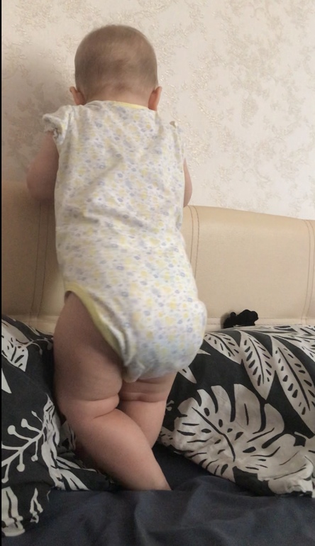 Ползает, встаёт у опоры, но не всегда правильно ставит стопу, заворачивает ножки вовнутрь. От этого долго стоять не может, а переступить пока не получается.