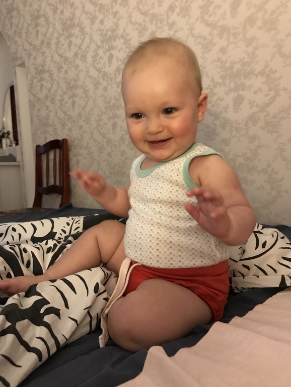 Одежда на 80, 74 все убрала. Голова 42,5 см, родничок на месте, такого же размера, как и при рождении. Подгузники - трусики размер 5, фирма какая-то Хз ...