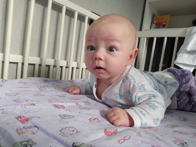 - пытается переворачиваться со спины на живот, но делает это только, если будет держать меня за руку и подтягиваться на ней, сам пока может только на бочок перевернуться, последние 3 дня поворачивается на бок во сне и так лучше спит;