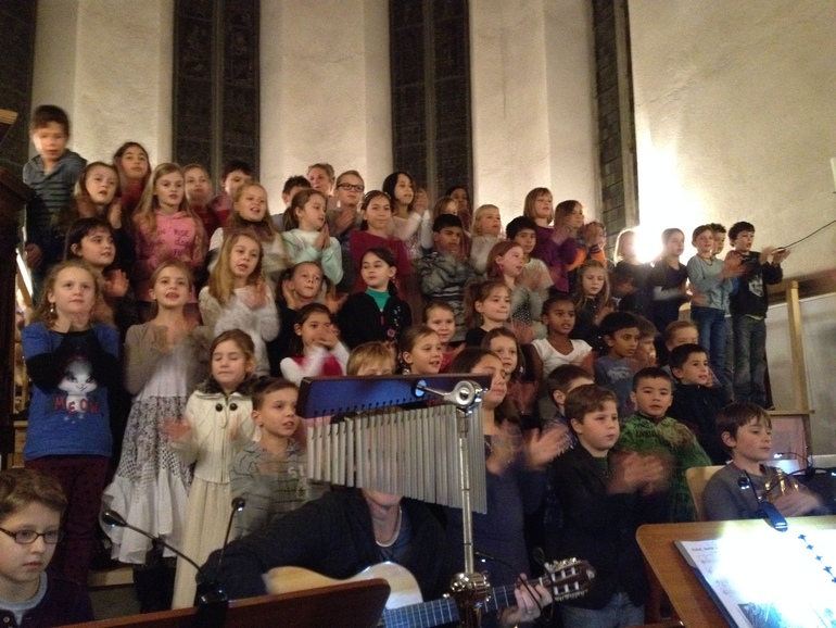 на сцене уже стояли дети, среди которых мы нашли одну соседку и 4 коллег по хору:-)