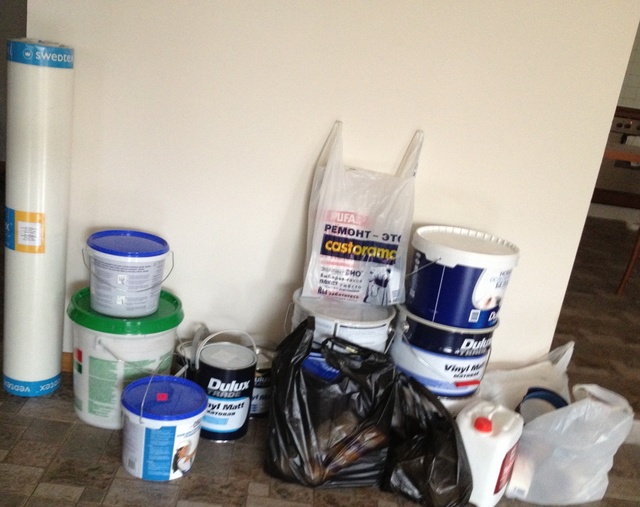 особо сэкономить на маляре не получилось, но надеюсь сделает хорошо - видно, что тетя старательная. Вот почти все наши покупки:)) пока завис только вопрос с козлами (малярный стол) где его взять всю голову сломала! И после ремонта нужна будет хорошая уборщица, чтоб все все очень хорошо вымыла, в тч балконные окна! Или может агентство клининговое? Знаете хорошее? пожелайте нам удачи и чтоб все прошло максимально быстро и безболезненно))))