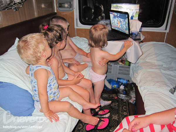 Добирались мы на поезде до Ейска, ехали ээ.. по-моему 28 часов. Выехали ночью, ехали две ночи. С нами в вагоне ехал такс Ричи :) В общем все было не так плохо, как я себе представляла - Женьку понравилось в поезде, на остановках мы выходили гулять, он прогуливался вместе с Ричи, пытался отобрать у хозяйки поводок :) Тетя, правда, напрягала местами - была ну просто тотально всем недовольна, грызла своего симпатичного 13летнего сына по поводу и без. В поезде кроме нас было полно детей, Женька шатался по вагону, флиртовал с девчонками, отжимал машинки у пацанов, смотрел мультики. В соседнем купе сидели два жадных мальчишки, у них он научился говорить "мое". Единственное - в поезде нет кондиционера и днем мы все были мокрые от пота. Ходила выяснять к начальнику вагона, действительно ли нет, или экономят.
