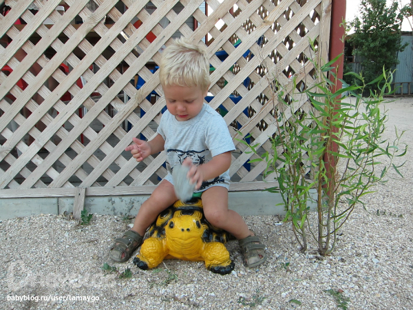 Есть у нас тут рядом две запруды, и там живут черепахи и рыба. Как-то мальчишки выловили черепаху сачком и нам показали. Женька был в восторге, и в следующий раз, когда мы пришли в кафе рядом с этими запрудами, все бегал туда и впрошал "де пака?" Потом поднимал руки ладошками вверх и сам себе отвечал "неть паки". Это надо было видеть)) А потом мы с ним нашли фигурку черепахи возле кафе - Женька побежал к ней с криками "пака, пака!", начал гладить по голове, обнимать и прижиматься щекой, оседлал)