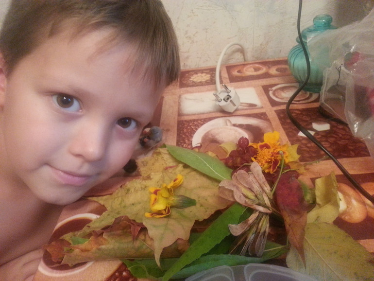 А Максим уже укладывал листочки, ягодки, цветы, и клеили. Вот что получилось.