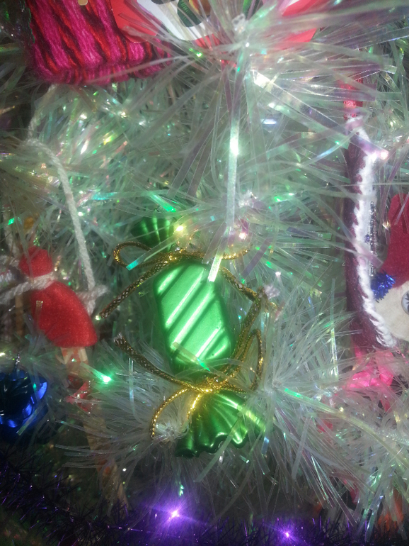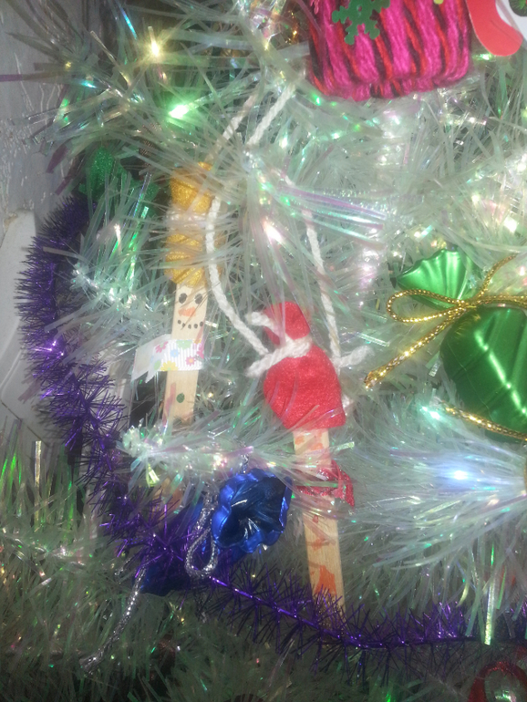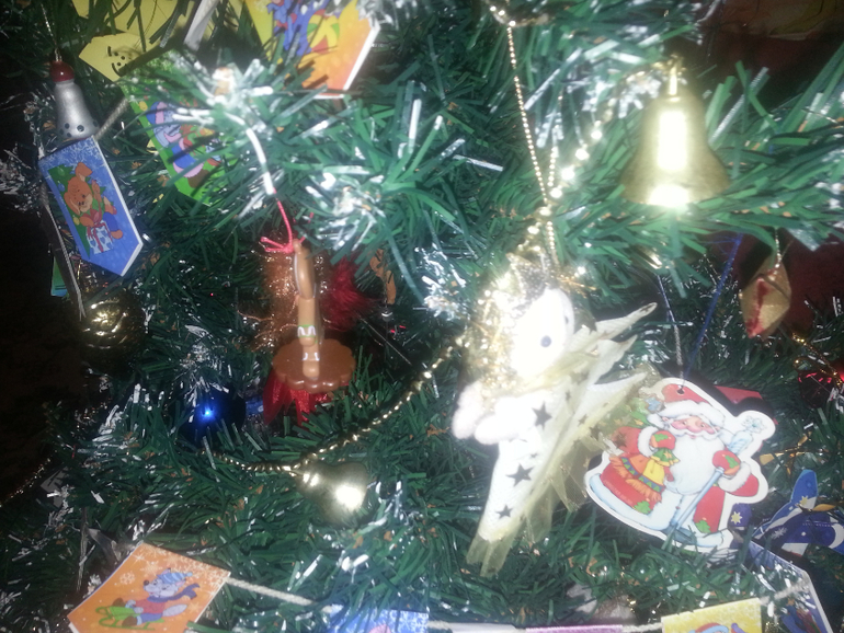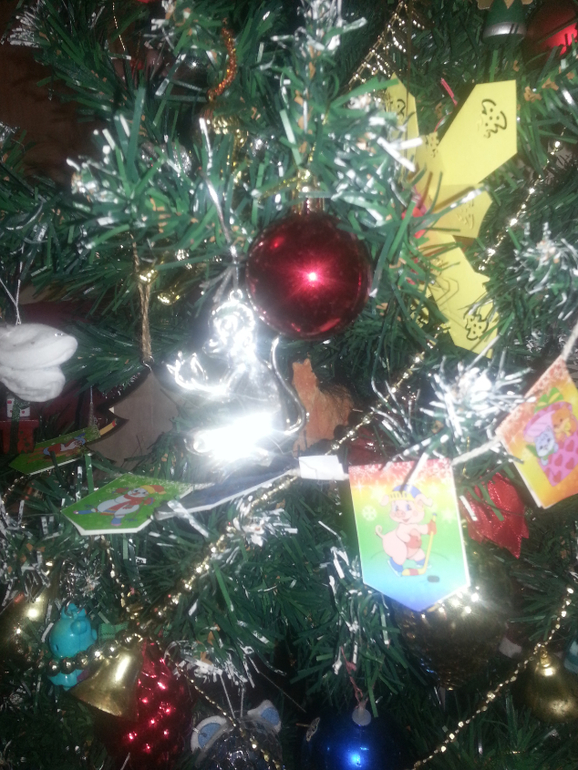 А маленькую ёлочку нарядили самодельными игрушками и пластмассовыми яркими конфетками