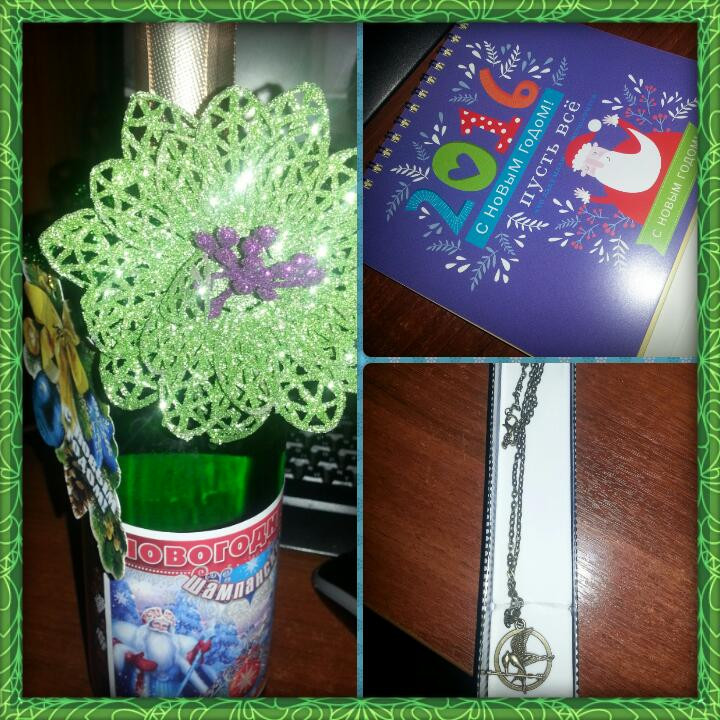 Подруге вручила шампанское, сыну её - новогодние ластики-конструкторы, а дочке, моей крестнице, книжечку такую же как у нас про пряничный домик (думаю теперь подруга меня "поблагодарит", когда крестница сразу побежит на кухню готовить))) и украшение "сойка-пересмешница" (здесь попала 100%, она фанатка голодных игр, бегала, крутилась перед зеркалом, фоткалась, отправляя фото друзьям)))