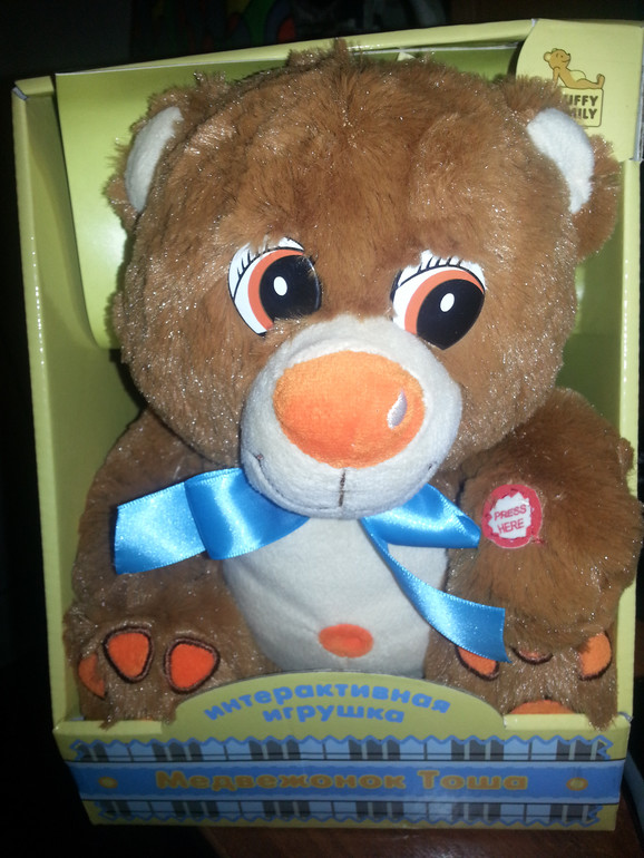 А их дочке очень суперского мишку по очень хорошей цене. Хотела ещё заказать, но теперь он стоит в три раза больше( Говорит очень чётко, поёт песни, сказки рассказывает, отвечает на вопросы.