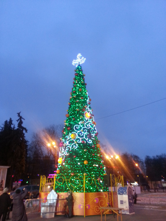 На площади стоит очень красивая ёлка с верхушкой-жар-птицей. Рядом почтовый ящик для писем и трон Деда Мороза (он правда на него так и не присел).