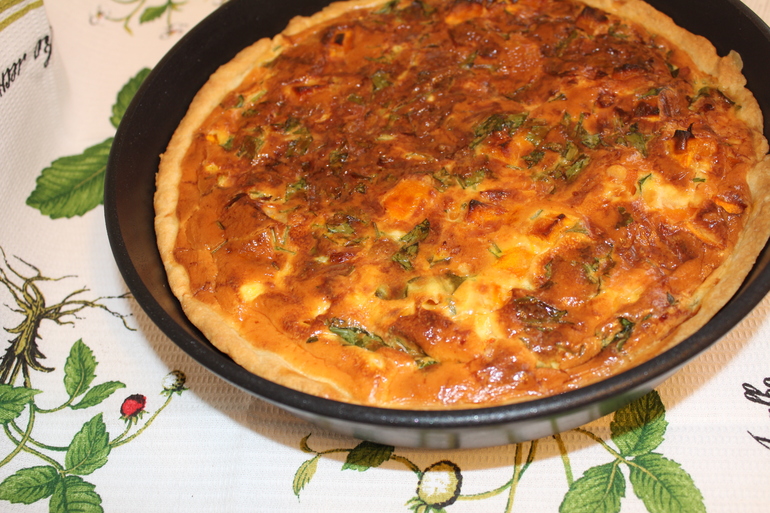 На тесто выложить запеченную тыкву, сверху равномерно распределить заливку.