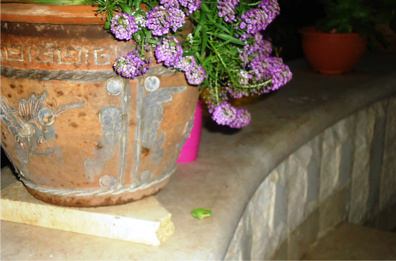 Выхожу я вечерком, темно уже, я сначала и не поняла, кто такой туточки - сидит какой-то жук большой у цветка, зелененький такой, жирненький))) Присмотрелась - а это лягушка))