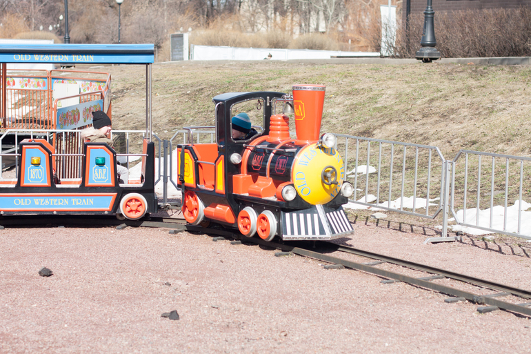 Поезд по кругу, машинист может гудеть. Пассажирам из кабинок совсем скучно. Рекомендую кататься только если в первой кабине машиниста.