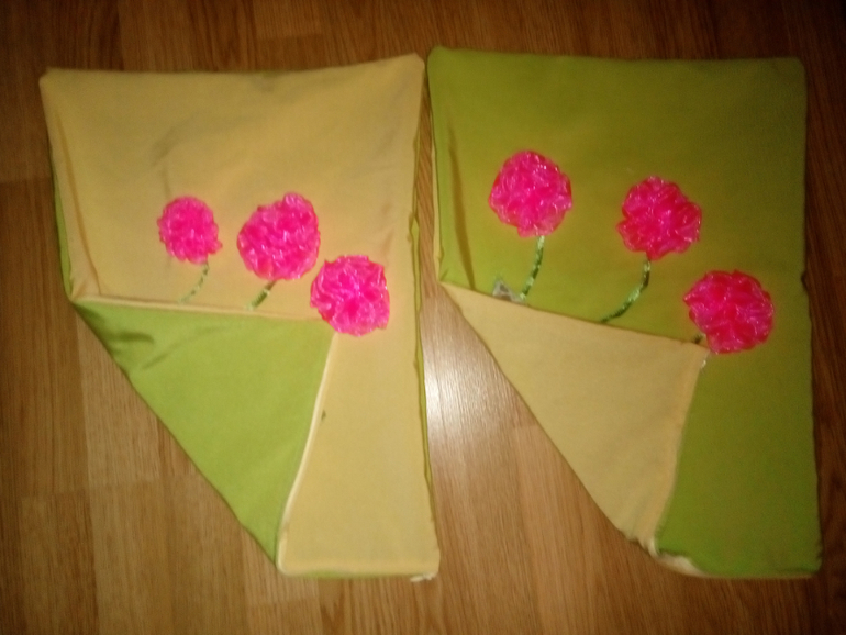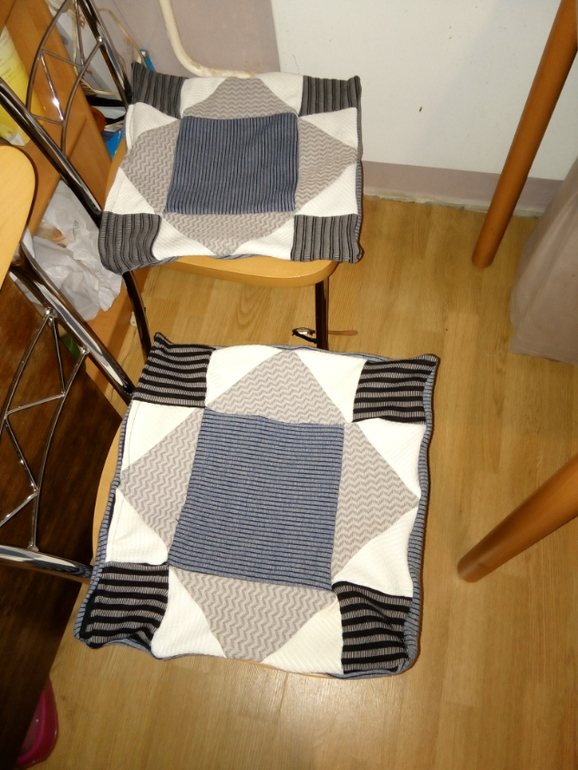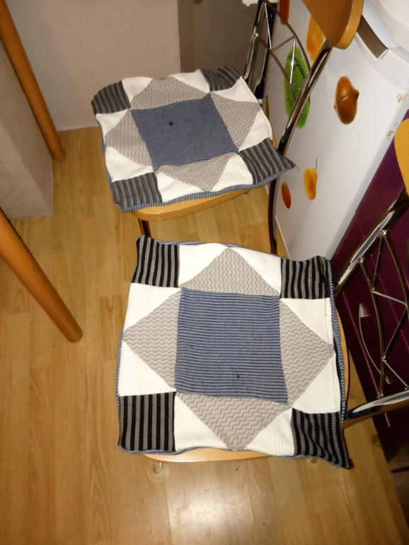 Попросили меня сделать сидушки-подушки на стулья. Осталось вставить поролоновые подушки. И вот что из этого вышло.