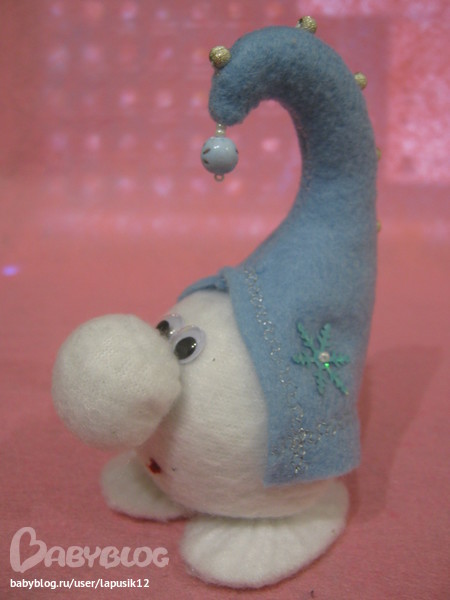 Всем привет! По МК в нэте (http://stranamasterov.ru/node/291233?c=favorite) слепила снежок из фетра, мягкого флиса и бусинок. Получился симпатяга!