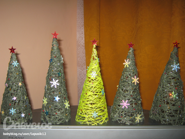 Из неиспользованных остатков пряжи, клея ПВА и пайеток мы наделали ёлочек и раздарили всем!