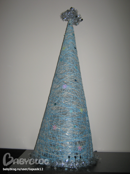 Из неиспользованных остатков пряжи, клея ПВА и пайеток мы наделали ёлочек и раздарили всем!